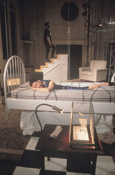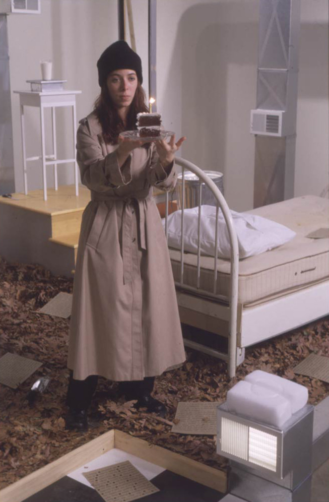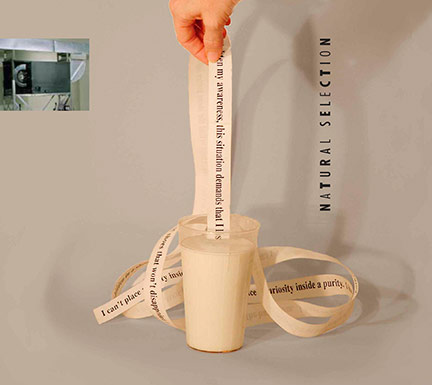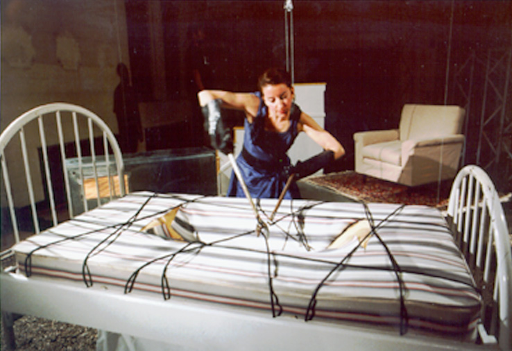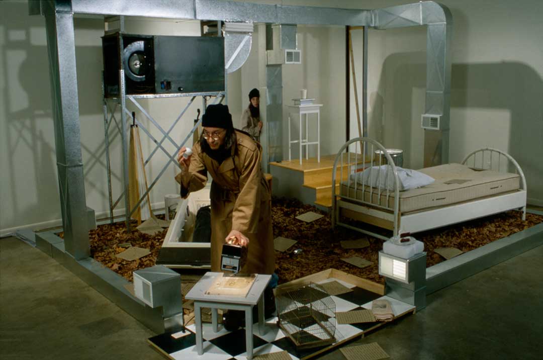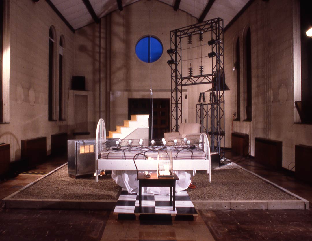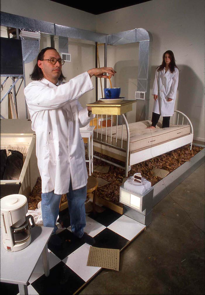 Natural Selection is a sound, installation, theater work created and presented in sections between 1995-1999 with a concert version presented in 2003 at the Detroit Institute of Arts. The sound composition is developed from a series of spoken/sung texts woven with the amplified sounds of power sources in the common household (electrical sounds, a forced air furnace, rattling plumbing, a coffee maker, a telephone answering machine, etc), These sound elements are combined with three to four instruments (keyboards, two saxophones, and an amplified staircase). The overall installation for Natural Selection, in it’s full installation staging, involves a platform divided, in equal sides, with dried leaves and pea gravel, a network of heating ducts and vents connected to a forced air furnace, an electrical transformer tower, a network of pipes and wiring conduit, a refrigerator that is partially fallen through the floor-surface, a large amplified staircase that leads nowhere, and a bed. For the concert version, a scaled-down version of the amplified staircase and the bed are the only large installation elements included. Many other smaller sound props from the original full-scale performance are used in the concert version.