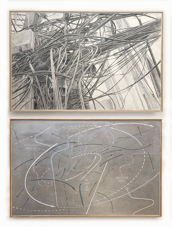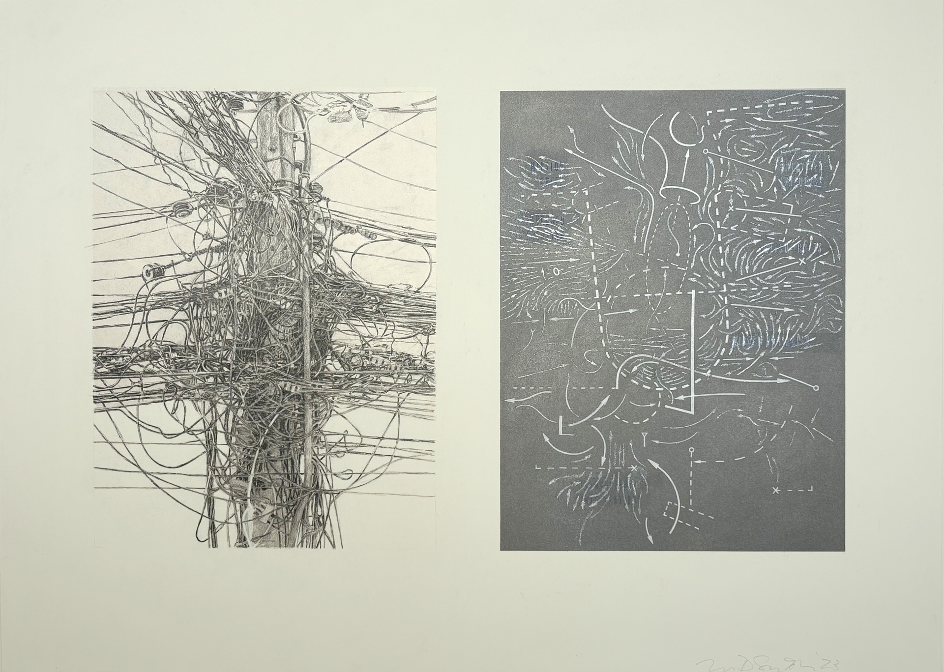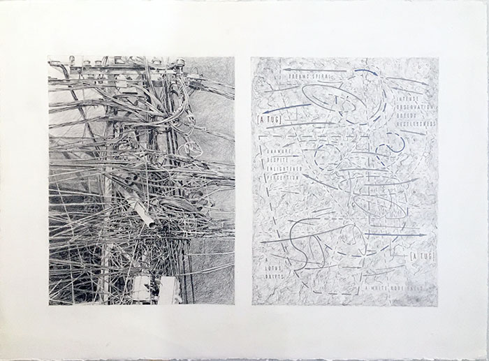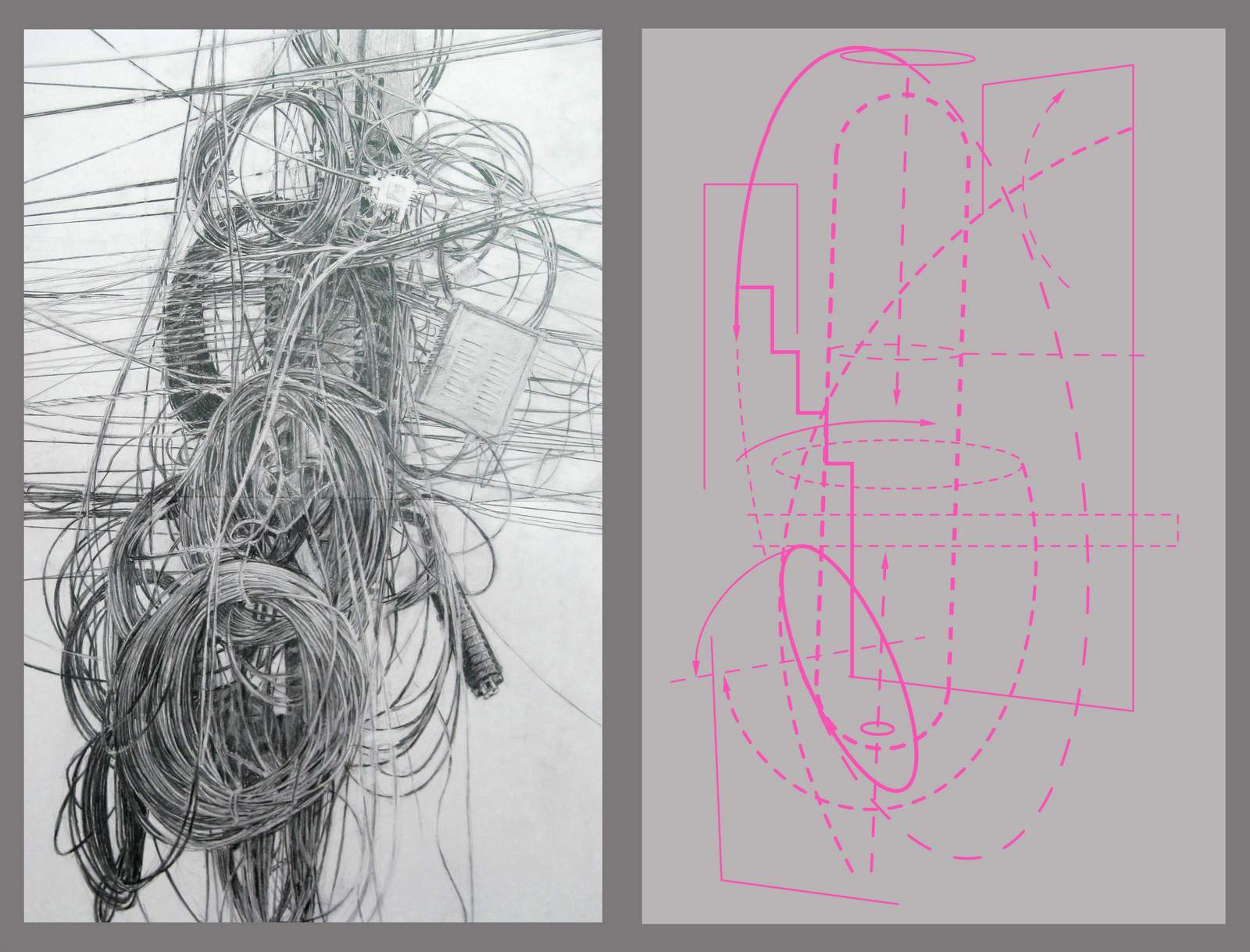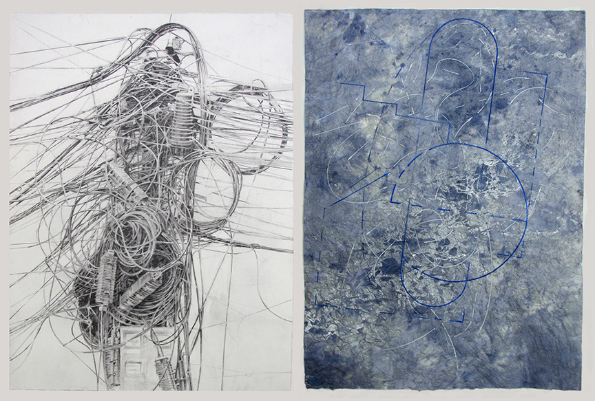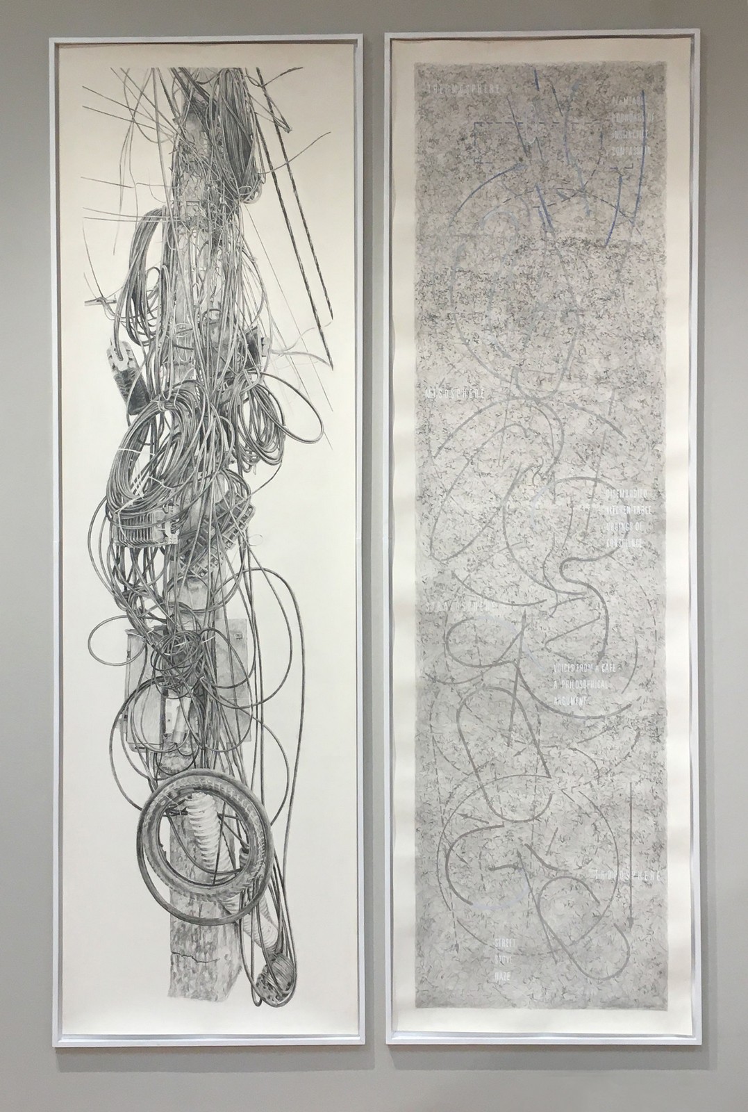 Since first encountering a tangle of public utility wires in Bangkok in 2006, I have thought about how these configurations might be representing the information and voices they carry or some larger idea. I finally began drawing the various wire configurations while in Hanoi in 2013. I chose graphite as the medium for the drawing since it is a conductive material and iridescent metallic paint and metal bits on various surfaces on the facing diagram to relate to ideas of preciousness as well as "transmission." This work is ongoing with several new wire/diagram pieces in-process in the studio.