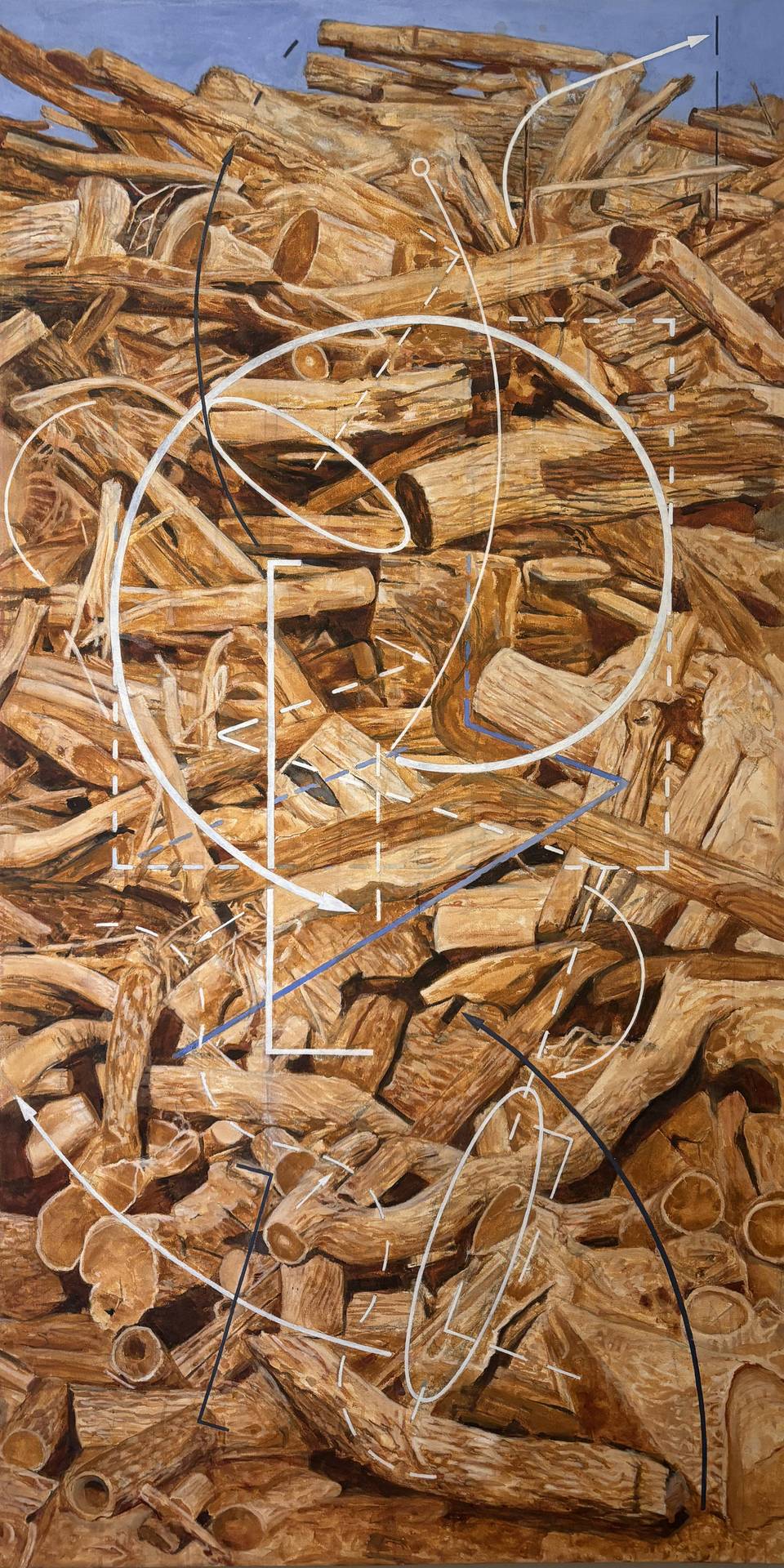 The Woodstack paintings are based on material close to home in central Kansas, It becomes more common to see large piles of tree limbs from cleared land or other phenomena (floods, storms etc.). These piles appear as corpses in a mass grave. The diagrams address interest in various traditions and ideas relating to death and transmigration.